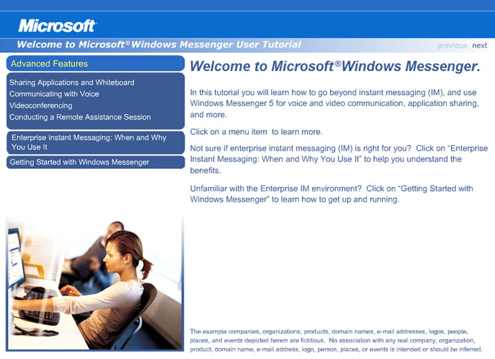 These tutorials for Microsoft teach the learner how to go beyond instant messaging (IM), and use Windows Messenger 5 for voice and video communication, application sharing, and more.